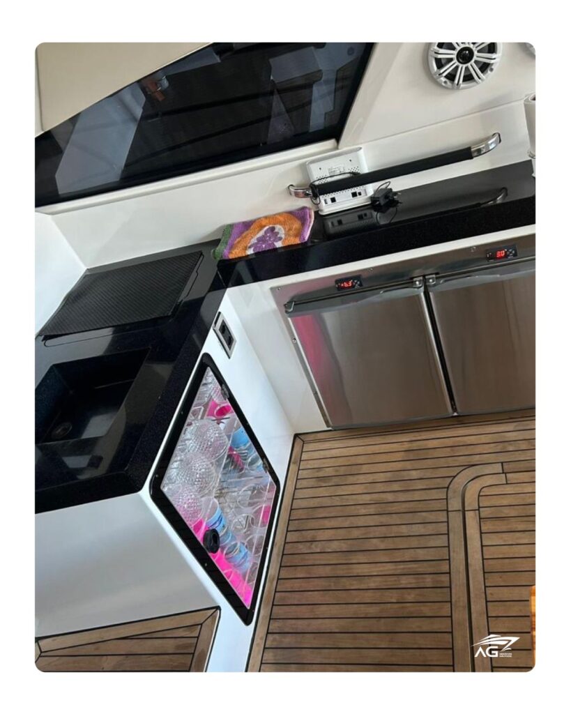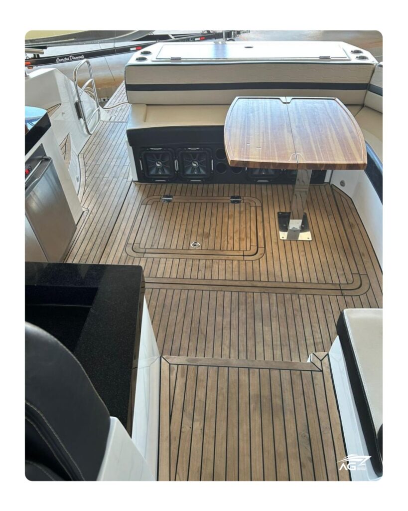 - Teca no cockpit, plataforma popa e no passadiço lateral