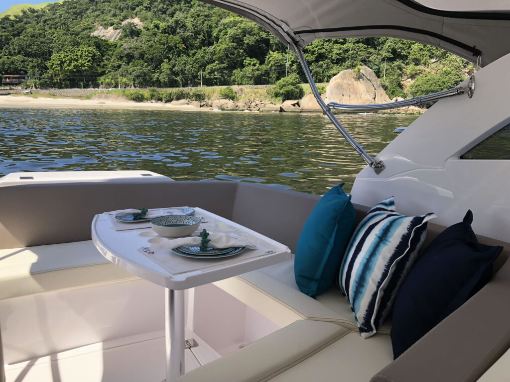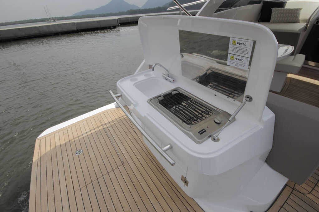 • Espaço gourmet na popa com churrasqueira com pedra vulcânica