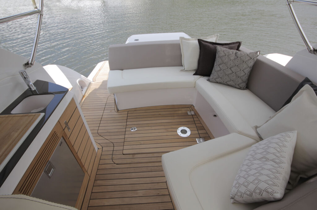 No exterior, além do espaço solário de proa, uma ampla plataforma na popa garantia um aproveitamento ainda melhor da área externa, oferecendo uma possibilidade da instalação de um móvel com churrasqueira, pia e armários.
