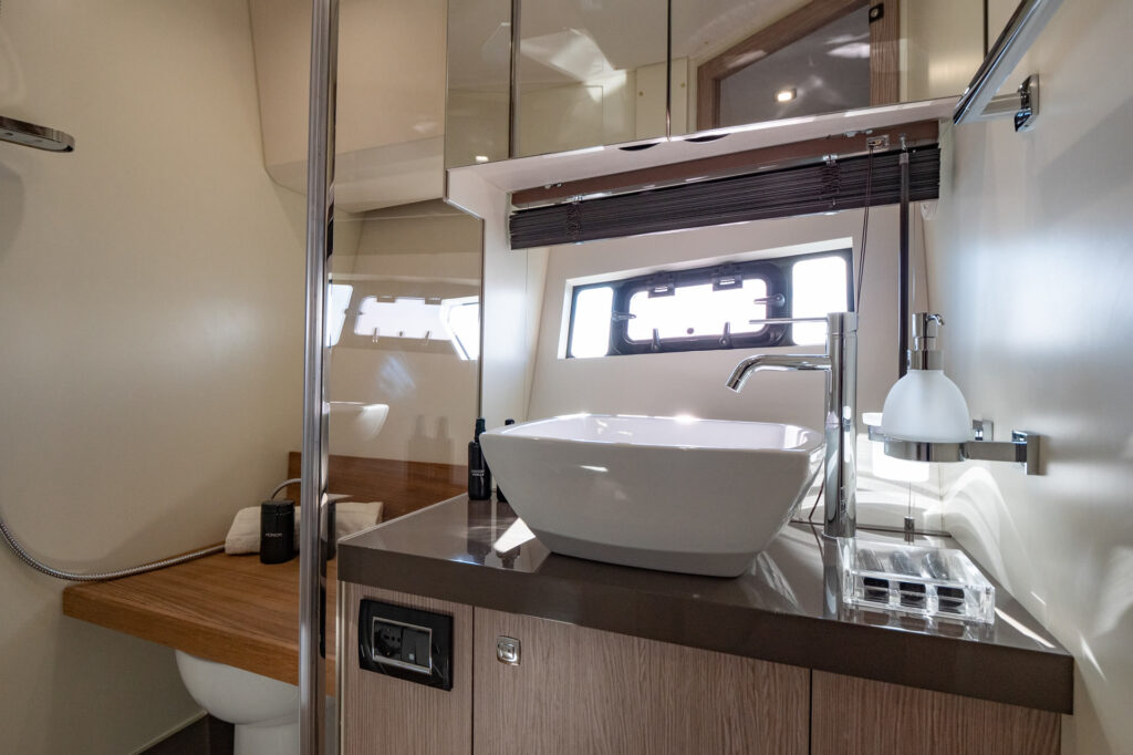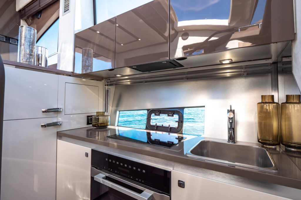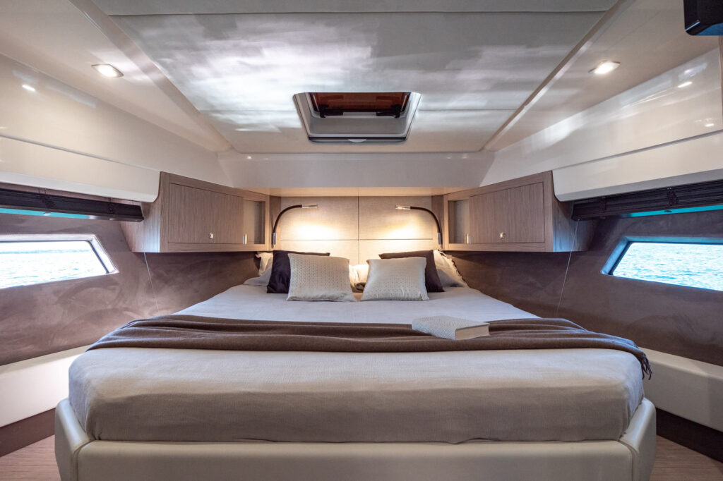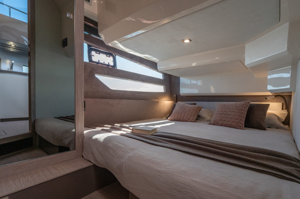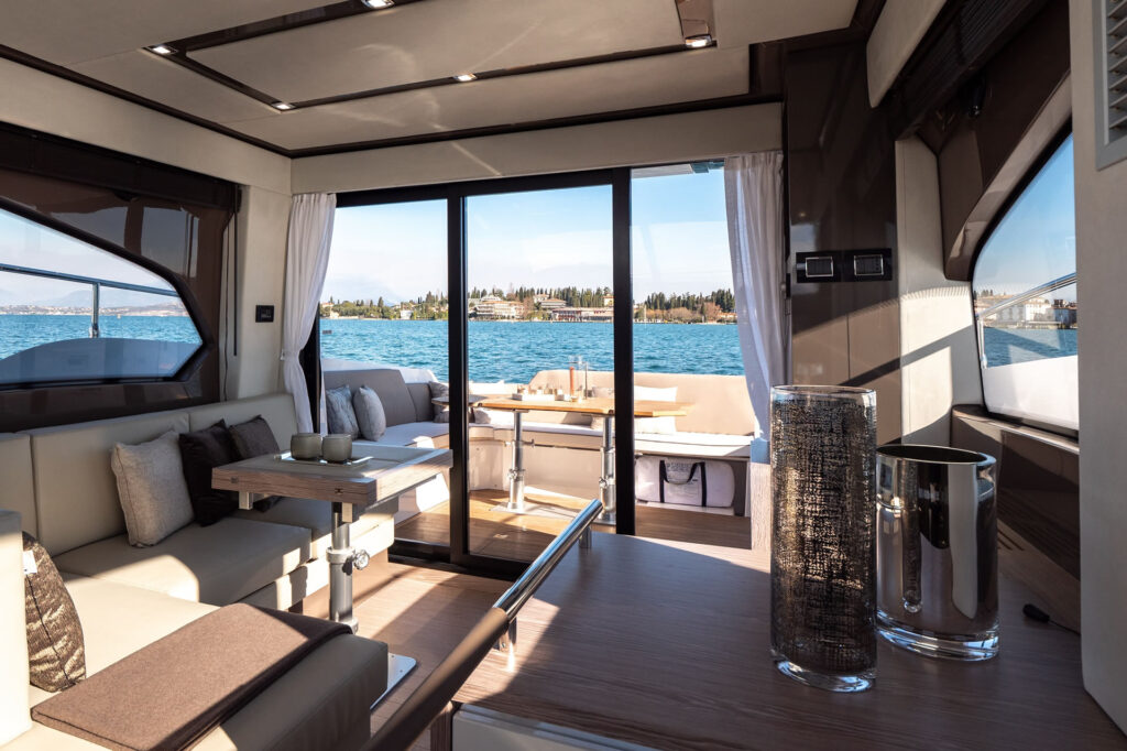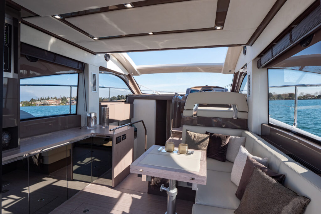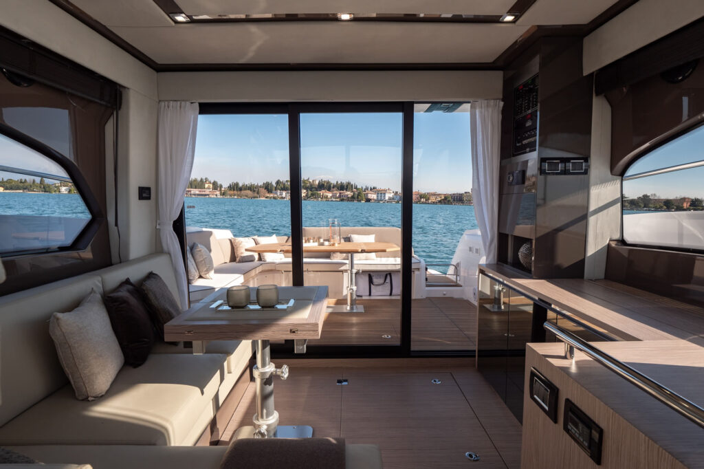 Um dos principais destaques é o seu layout, desenvolvido para beneficiar as áreas ao ar livre, oferecendo um agradável espaço de convivência no cockpit com espaço gourmet na popa. Já em seu interior o modelo traz um salão principal amplo e aconchegante, com acabamento e materiais que se integram com a visão privilegiada do mar através de suas janelas panorâmicas e portas de vidro.