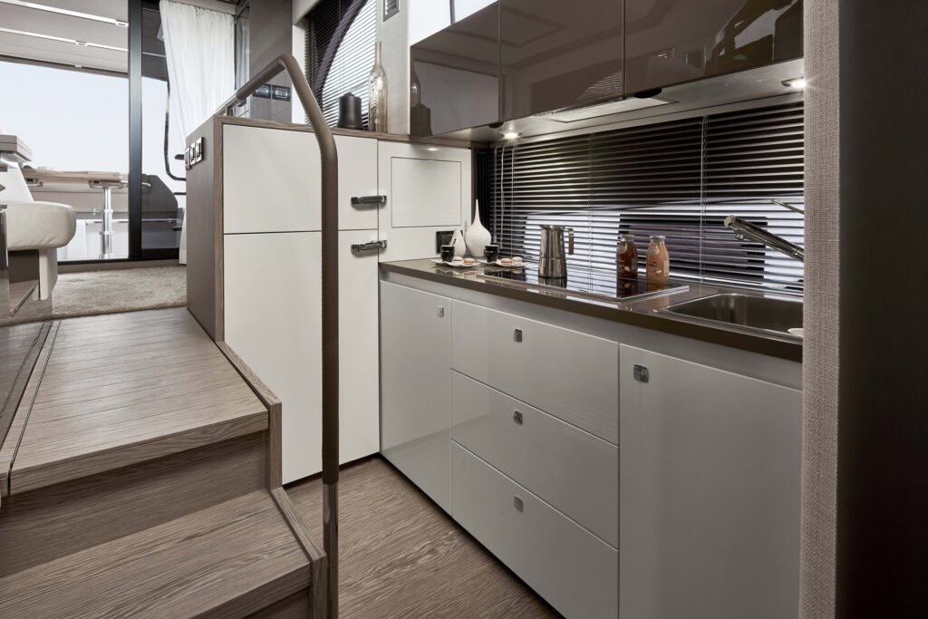 Na versão brasileira ela ganhou uma plataforma maior que o modelo italiano, tendo 13,20 metros de comprimento de casco, 4m de boca e 6,5 m² de área de convivência no fly. Na parte inferior, o destaque fica por conta da cozinha completa e uma aconchegante sala, além de duas confortáveis suítes. A versão brasileira ainda oferece espaço gourmet na popa, com churrasqueira de pedra vulcânica, pia, bancada e armário amplo.