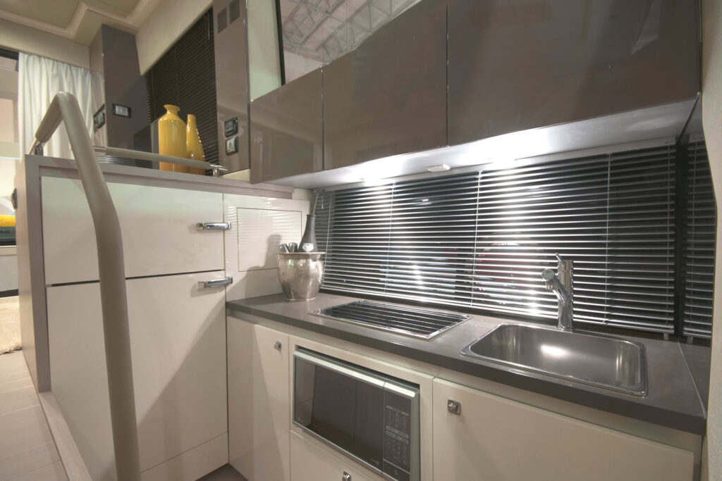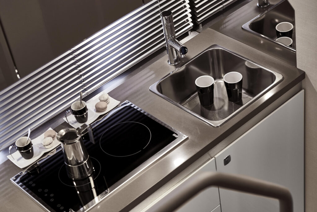 • Cozinha completa com móveis em laca, bancada em Corian® com pia em aço inox e misturador com água quente e fria, fogão vitrocerâmico, exaustor, geladeira 125l, freezer 40l, micro-ondas e lixeira