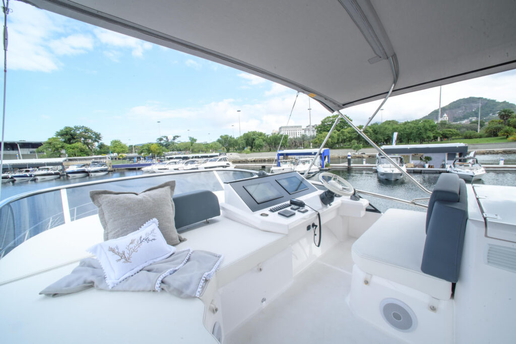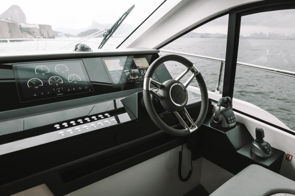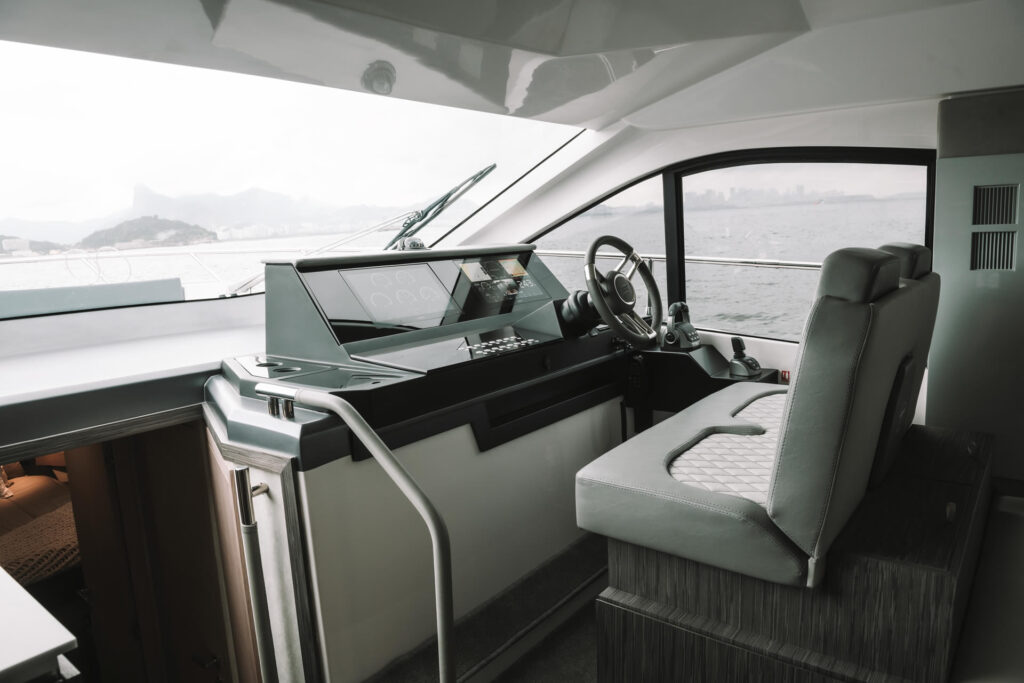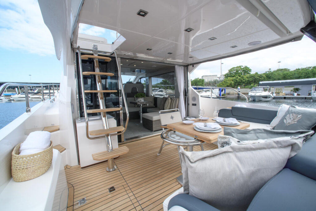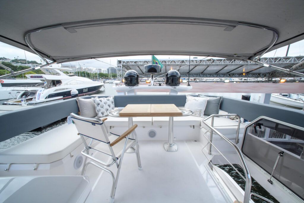 Com a independência e privacidade garantidas pelas 3 cabines já presentes no layout italiano, o grande plus da versão brasileira foi a inclusão de 3,5 pés no comprimento total da embarcação com foco na ampliação da área de convivência na praça de popa.