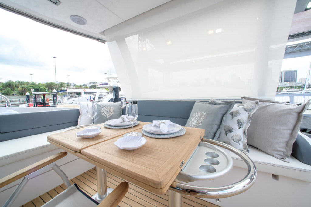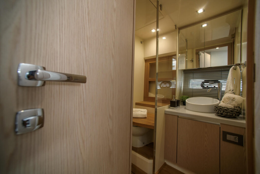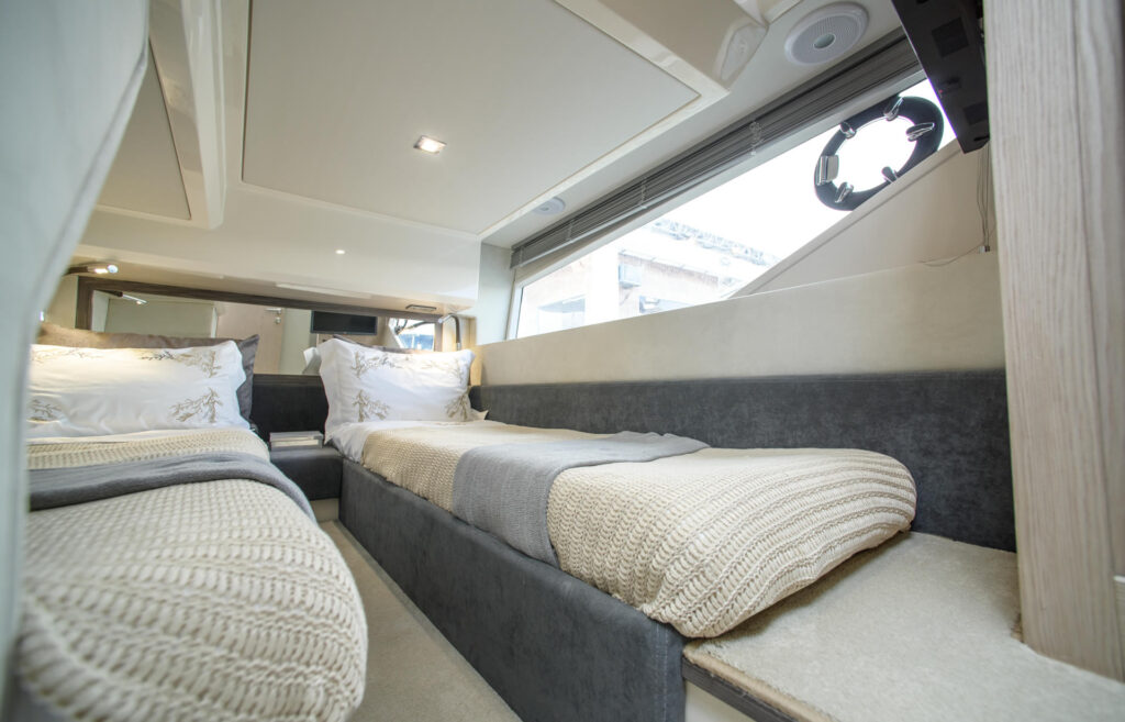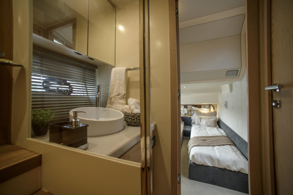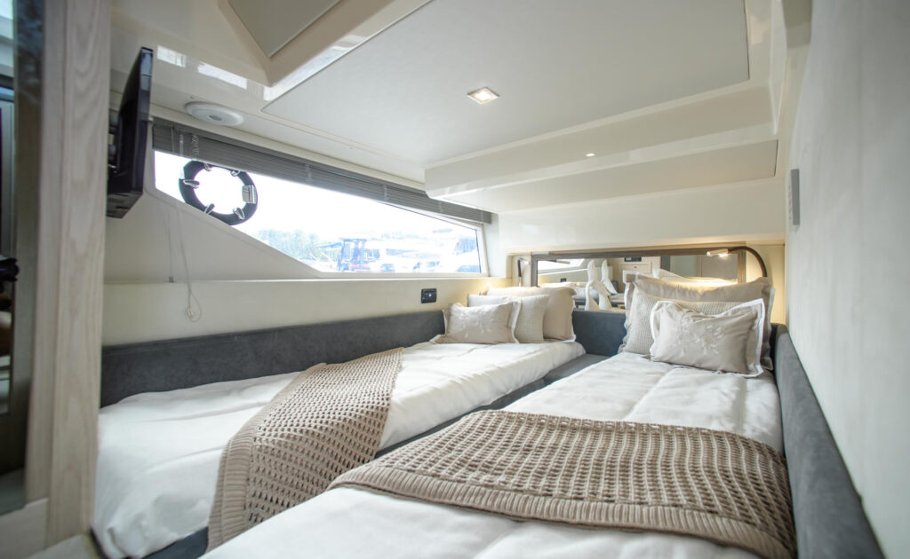 Com a independência e privacidade garantidas pelas 3 cabines já presentes no layout italiano, o grande plus da versão brasileira foi a inclusão de 3,5 pés no comprimento total da embarcação com foco na ampliação da área de convivência na praça de popa.