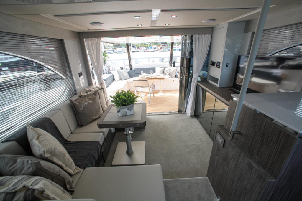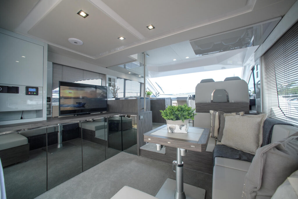 O novo modelo oferece ainda duas opções de layouts de cozinha, a primeira opção segue a versão italiana original, com uma área de copa centralizada a meia nau. Já na segunda opção de layout, a cozinha fica na popa e é integrada ao cockpit.