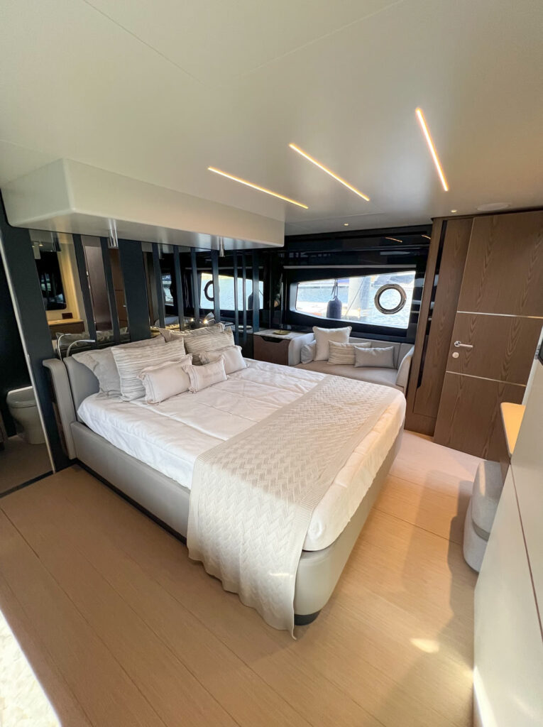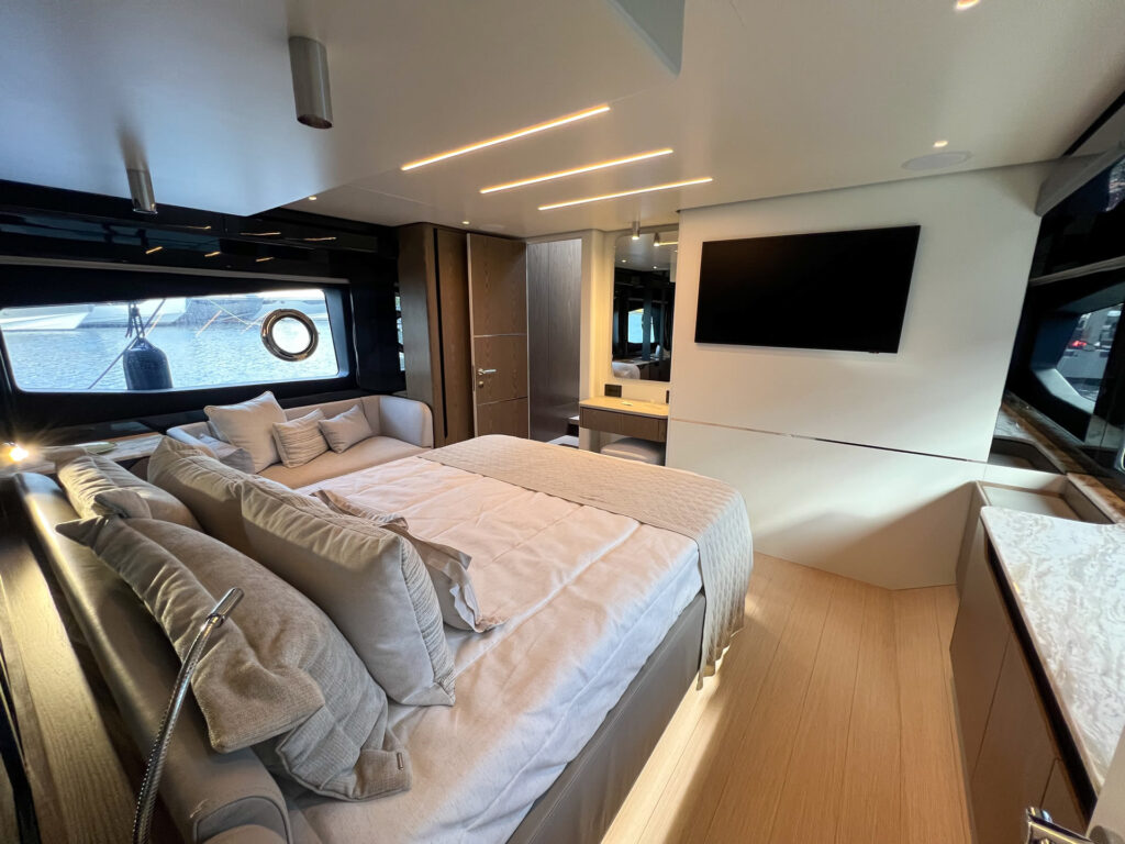 A Sessa F60 é o equilíbrio perfeito entre usabilidade, conforto e tecnologia, com a inconfundível elegância do design italiano. Entre os destaques estão seu amplo salão, além de suas três suítes completas, incluindo uma cabine master que ocupa toda a largura da embarcação, com sofá, closet e janelas panorâmicas.